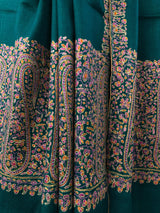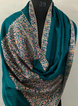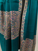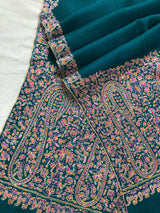 Deep teal blue artisanal Sozni micro fine hand embroidered palla authentic cashmere pashmina stole shawl